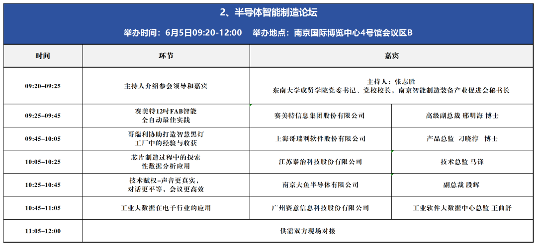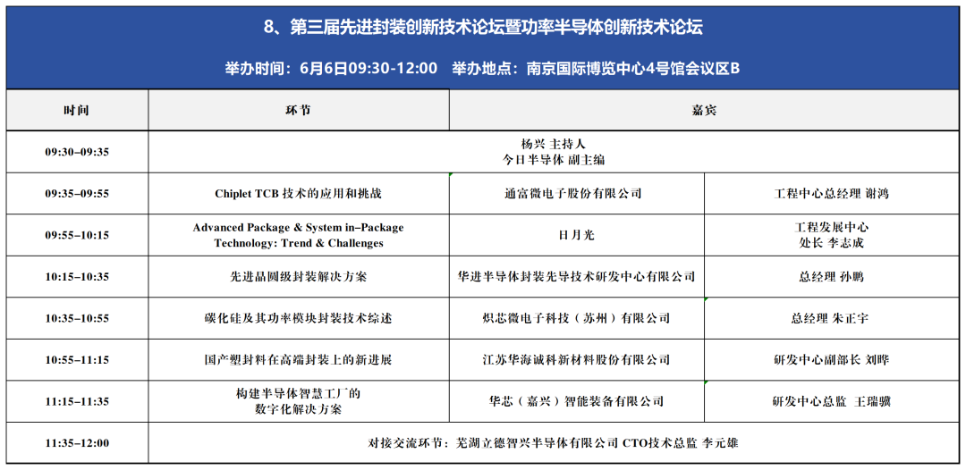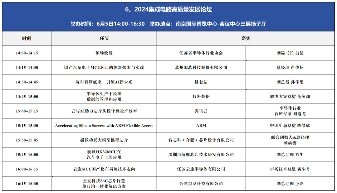 今年展会现场除了将云集台积电、通富微电、华进半导体、扬州扬杰、大鱼半导体、晟联科、盛美上海、芯华章、徐州博康等200余家参展企业外,还将举办2024 人工智能创新应用国际峰会、半导体智能制造论坛、半导体设备及核心零部件产业发展论坛等10场专业论坛,来自华为、新思、Cadence、日月光、哥瑞利、富瀚微、赛美特等行业领军企业的近百位专家学者将悉数登场,带来精彩的技术分享和行业报告。