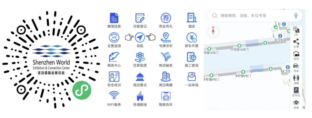 扫描二维码进入展馆小程序,点击导航,进入展馆导航界面,展商可自由定位规划展馆区域内的导航路线。