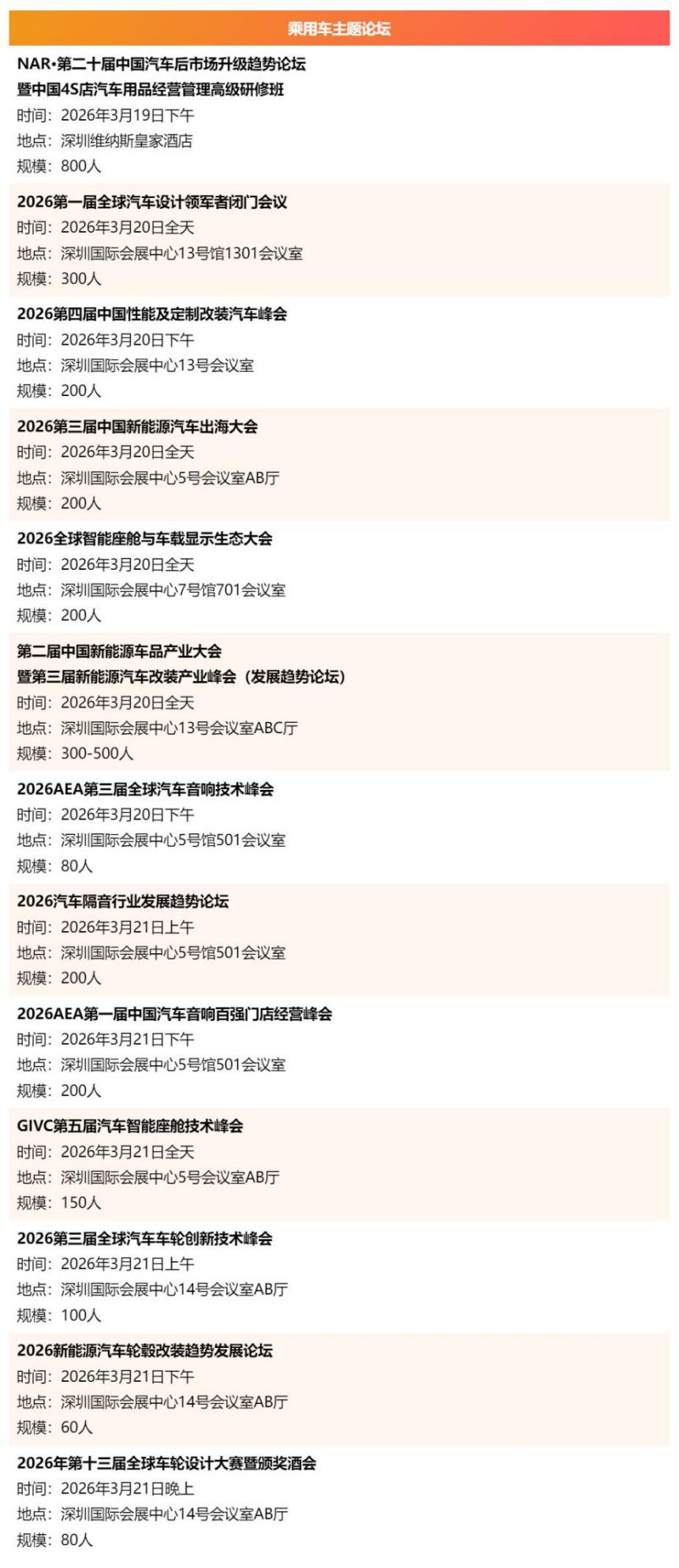 2026年展会同期将围绕乘用车、商用车、跨境出海、汽车文化等热点,设置70+场行业趋势论坛、国际技术峰会、跨境电商大会、文化赛事,以前瞻议题和深度洞察,为全产业链的参与者带来新的启发与合作契机,注入强劲发展动能,共同助力企业在转型浪潮中抢占先机。