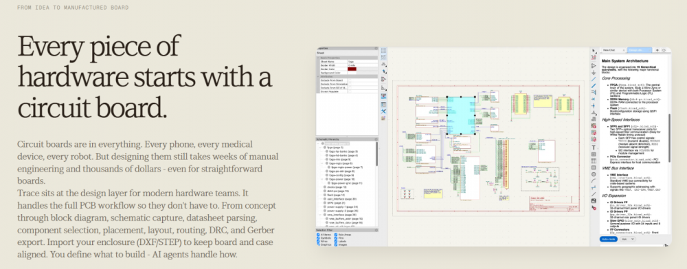 Trace为硬件团队提供设计层面的支持。它能处理整个PCB工作流程,让团队无需亲力亲为。从概念到电路图、原理图绘制、数据表解析、元件选择、布局、布线、设计规则检查(DRC)以及Gerber文件导出,一应俱全。