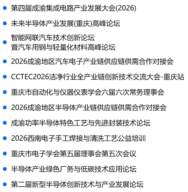 同期还将举办10余场高端活动——第四届成渝集成电路产业发展大会(2026)、未来半导体产业发展(重庆)高峰论坛等,聚焦“先进封测技术、成渝功率半导体特色工艺、半导体、汽车产业链供应链供需合作” 等热点议题,邀请行业专家学者、企业高管现场分享见解,解读半导体产业发展趋势,不仅为参会者提供了免费的交流机会,更助力打通产业链信息壁垒。