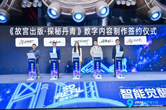在签约仪式环节,联通沃音乐文化有限公司、广东南方新媒体股份有限公司、上海众视数字科技有限公司、中鼎天下(北京)文化科技有限公司、北京荣宝智造文化有限公司共同签署"故宫出版?探秘丹青"数字内容制作协议,该项目以故宫出版社授权的传世名画《千里江山图》为核心IP,借助全球领先的XR技术,将这幅近千年的青绿山水名作转化为可沉浸式漫游的数字空间。