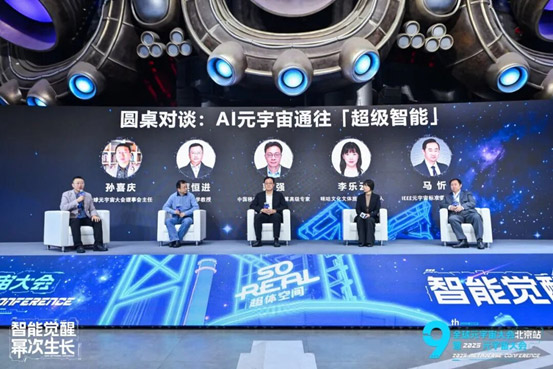 在"AI元宇宙通往'超级智能'"主题对谈中,主持人孙喜庆与国际先进技术与工程院院士蔡恒进、中国移动北京公司智算高级专家郭强、咪咕文化科技有限公司文体旅行业负责人李乐云、IEEE元宇宙标准委员会秘书长马忻四位嘉宾,围绕AI与元宇宙的关系、AGI发展及其应用、超级智能及人类未来等话题展开讨论。