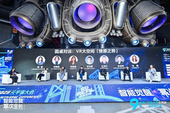 在"VR大空间'燎原之势'"圆桌对谈中,主持人北京师范大学艺术与传媒学院教授周雯与HTC中国区业务总裁华晓枫、天枢寰宇(北京)航天科技有限公司CEO张鹤睿、抖音XR/PICO视频产品负责人李正卿、秀加科技 (北京) 有限公司创始人张泽宁、中国移动咪咕新空副总经理朱佳伟、宇宙猜想(北京)科技有限公司CEO马瑞六位嘉宾,从文化、技术、产业三个维度展开讨论,观点鲜明。
