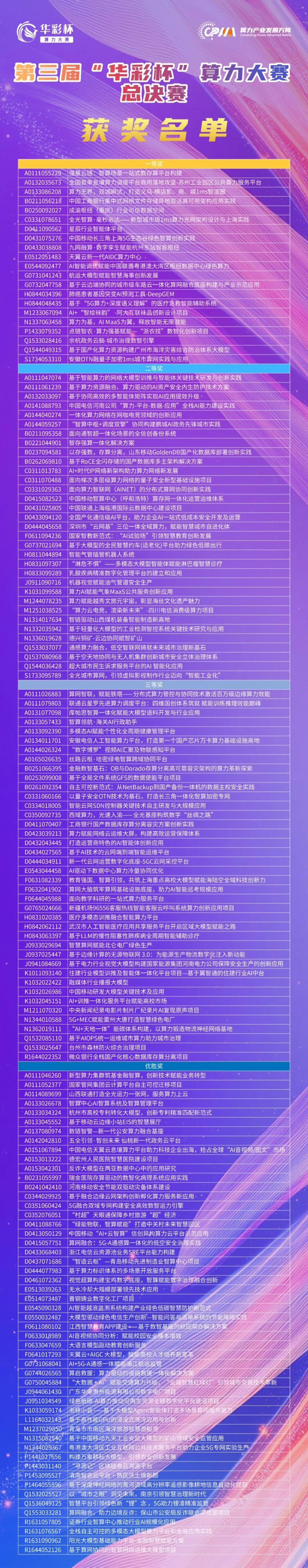 《基于智能算力的网络大模型训推与智能体关键技术研发与创新实践》《基于算力资源融合、算力驱动的AI资产安全内生防护技术方案》《基于协同高效的多智能体矩阵实现AI应用提效升级》等33个项目获得第三届“华彩杯”算力大赛总决赛二等奖。中国通信标准化协会理事长闻库、中国信息通信研究院党委书记李冠宇为二等奖获奖代表颁奖。