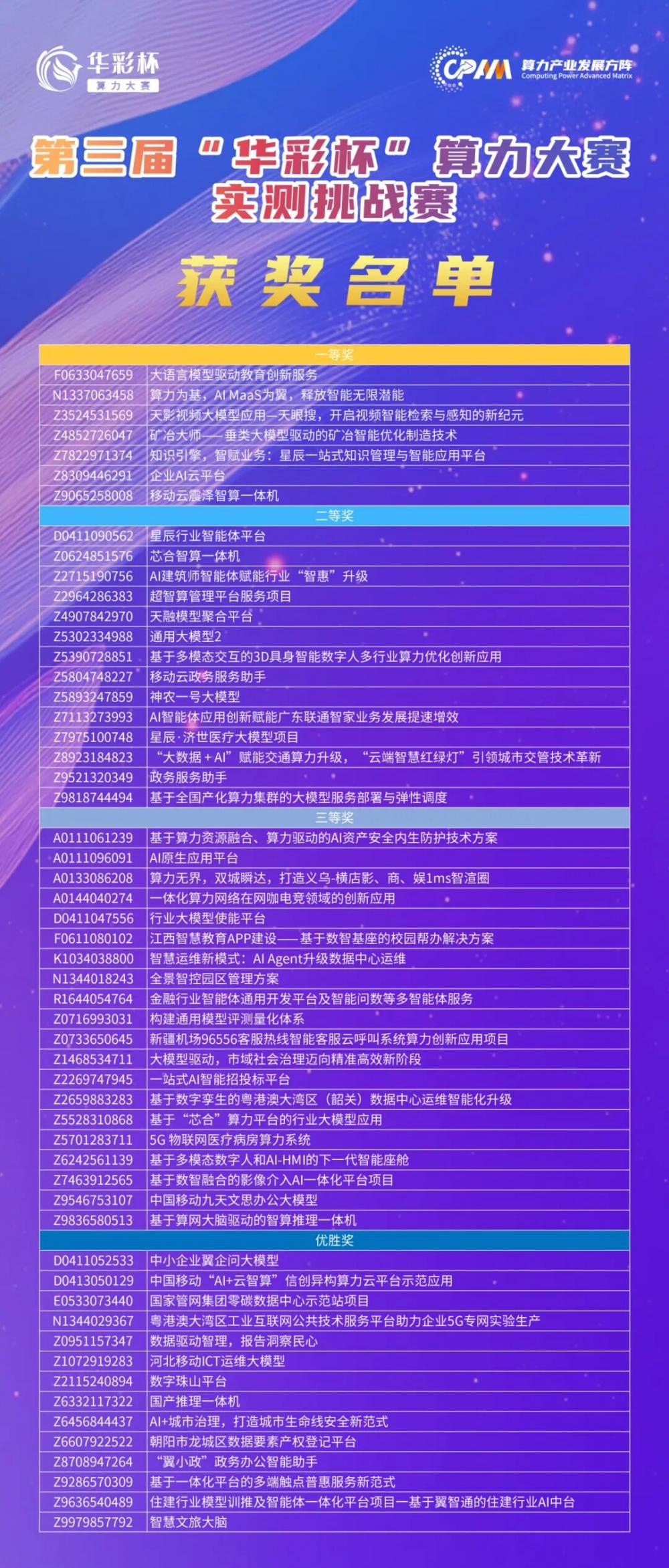 在第三届“华彩杯”算力大赛实测挑战赛中,《大语言模型驱动教育创新服务》《算力为基,Al MaaS为翼,释放智能无限潜能》《天影视频大模型应用——天眼搜,开启视频智能检索与感知的新纪元》等7个项目获得实测挑战赛一等奖,《星辰行业智能体平台》《芯合智算一体机》《AI建筑师智能体赋能行业“智惠”升级》等14个项目获得实测挑战赛二等奖,《基于算力资源融合、算力驱动的AI资产安全内生防护技术方案》《AI原生应用平台》《算力无界,双城瞬达,打造义乌——横店影、商、娱1ms智渲圈》等20个项目获得实测挑战赛三等奖。