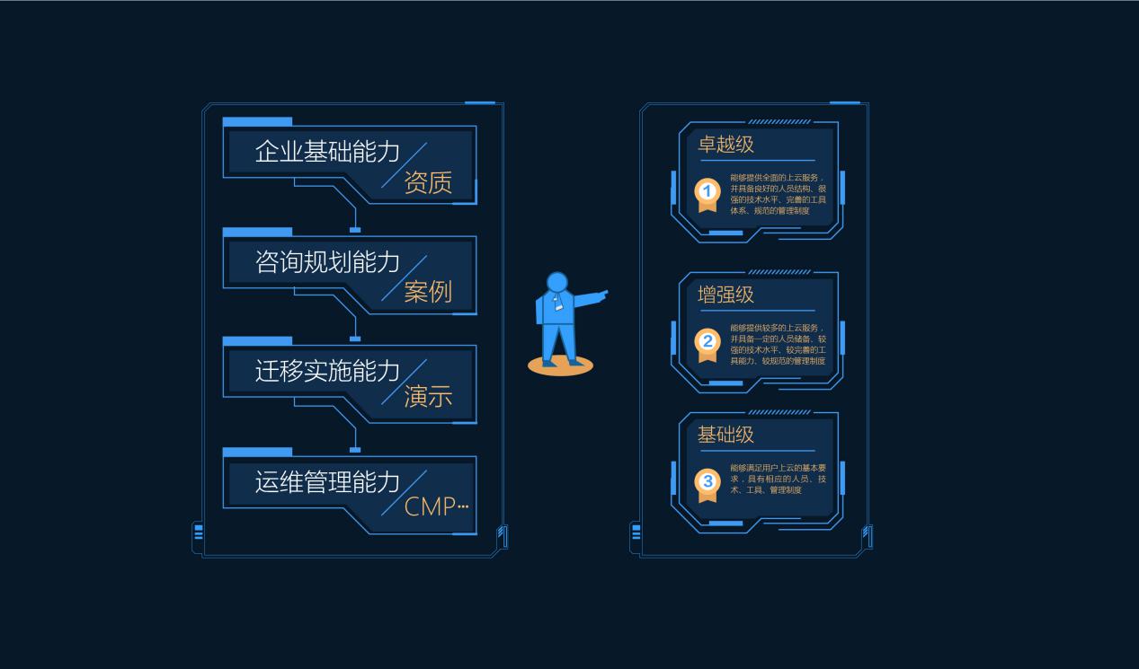 对于云MSP的服务能力要求,《云管理服务提供商能力要求》系列标准以企业上云为导向,按照企业基础能力、咨询规划能力、迁移实施能力和运维管理能力四方面,共计34个能力子项,102条指标,将评估结果划分成基础级、增强级和卓越级三个等级。