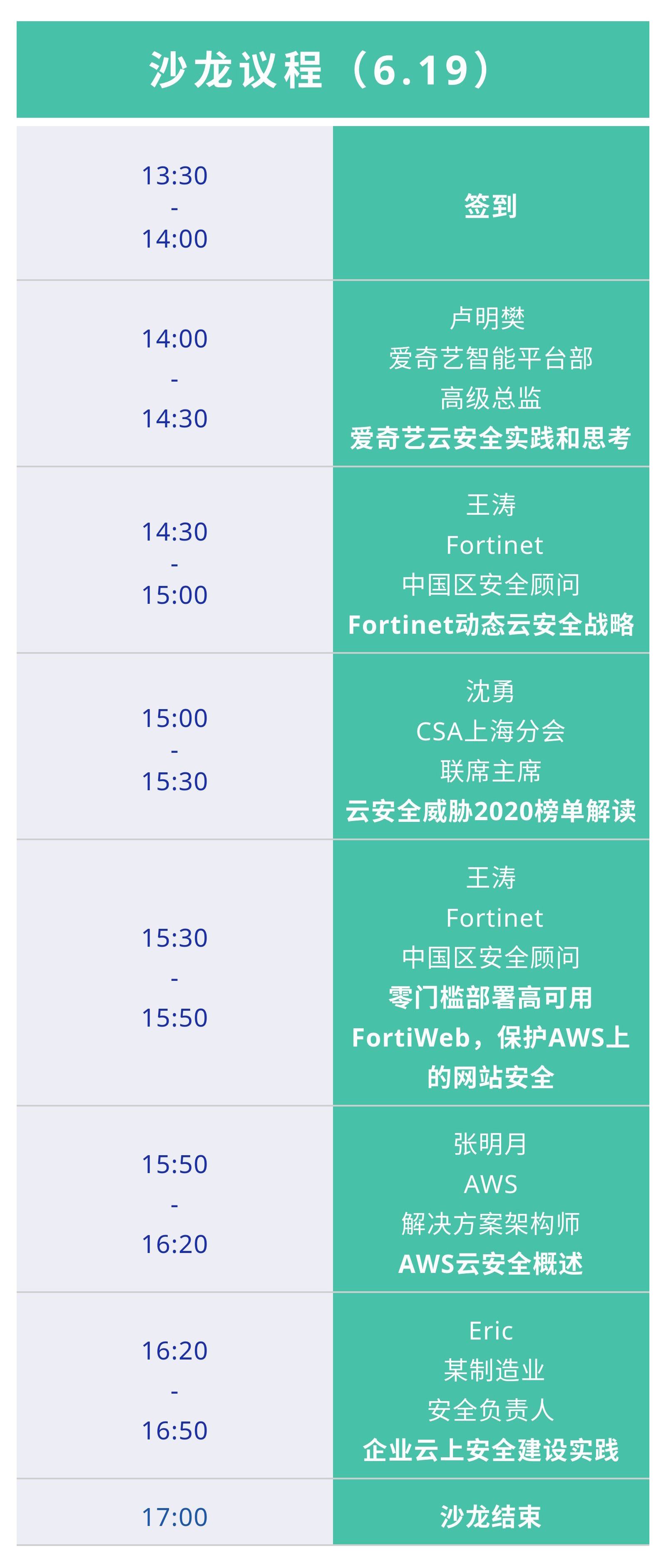6月19日,安全+ 力邀爱奇艺、Fortinet、CSA上海分会、某制造业及AWS的资深云安全专家,为大家带来安全+ 第二十四期沙龙之云安全,共同探讨并分享云安全的实践经验。