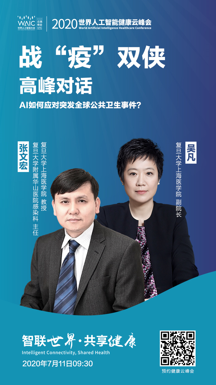 7月10-11日,复旦大学上海医学院吴凡副院长和复旦大学附属华山医院张文宏教授,与您相约“2020世界人工智能健康云峰会”·AI+公共卫生专题论坛,共同把脉人工智能助力公共卫生体系建设新未来。