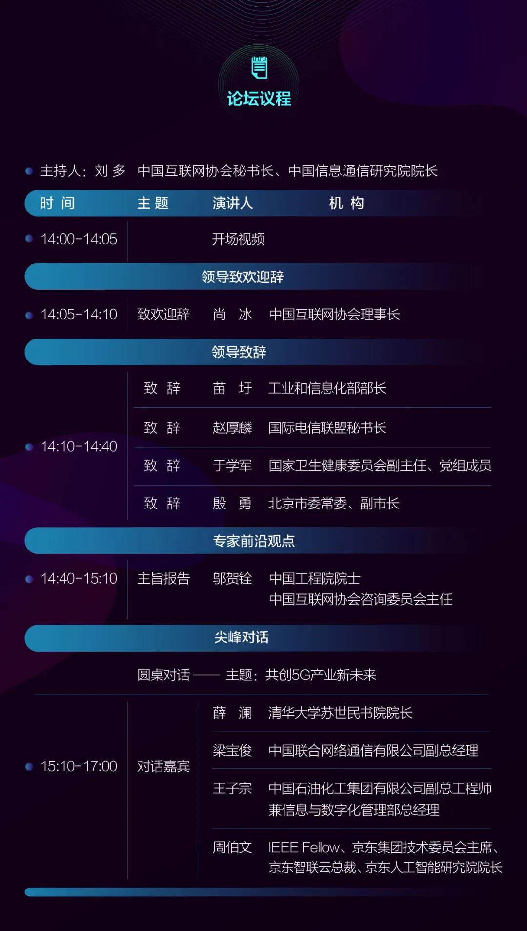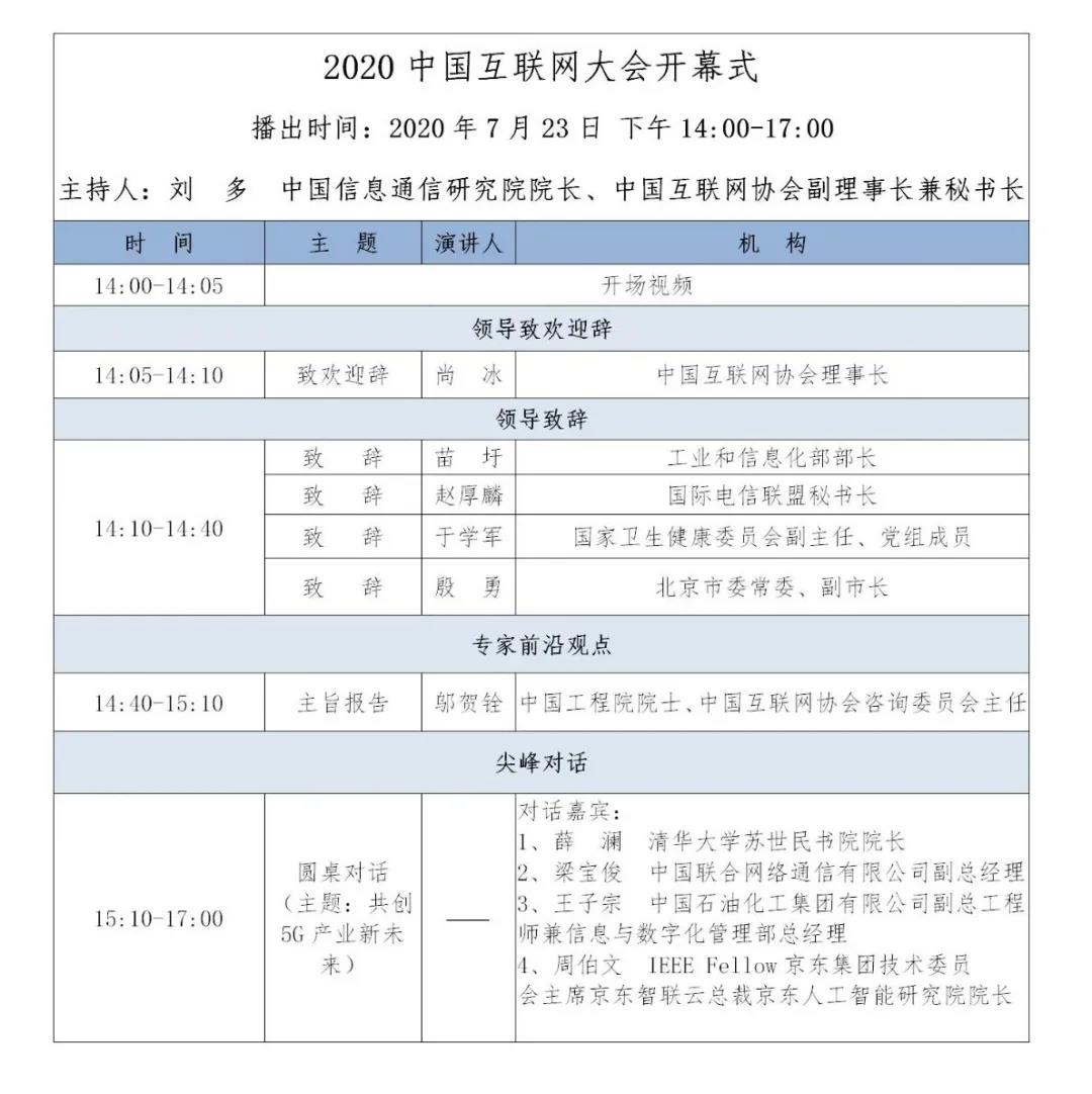7月23日下午14:00,2020年(第十九届)中国互联网大会将在云端正式拉开帷幕。工业和信息化部部长苗圩,国际电信联盟秘书长赵厚麟,国家卫生健康委员会副主任、党组成员于学军,北京市委常委、副市长殷勇等政府部门领导将在开幕式上致辞,中国互联网协会理事长尚冰将致欢迎辞,中国工程院院士、中国互联网协会咨询委员会主任邬贺铨将作主旨报告,分享前沿观点。开幕式特别设置了“尖峰对话”环节,来自清华大学、中国联通、中国石化、京东集团的重量级嘉宾将围绕“共创5G产业新未来”进行一场精彩的“对话”。中国信息通信研究院院长、中国互联网协会副理事长兼秘书长刘多将主持开幕式。