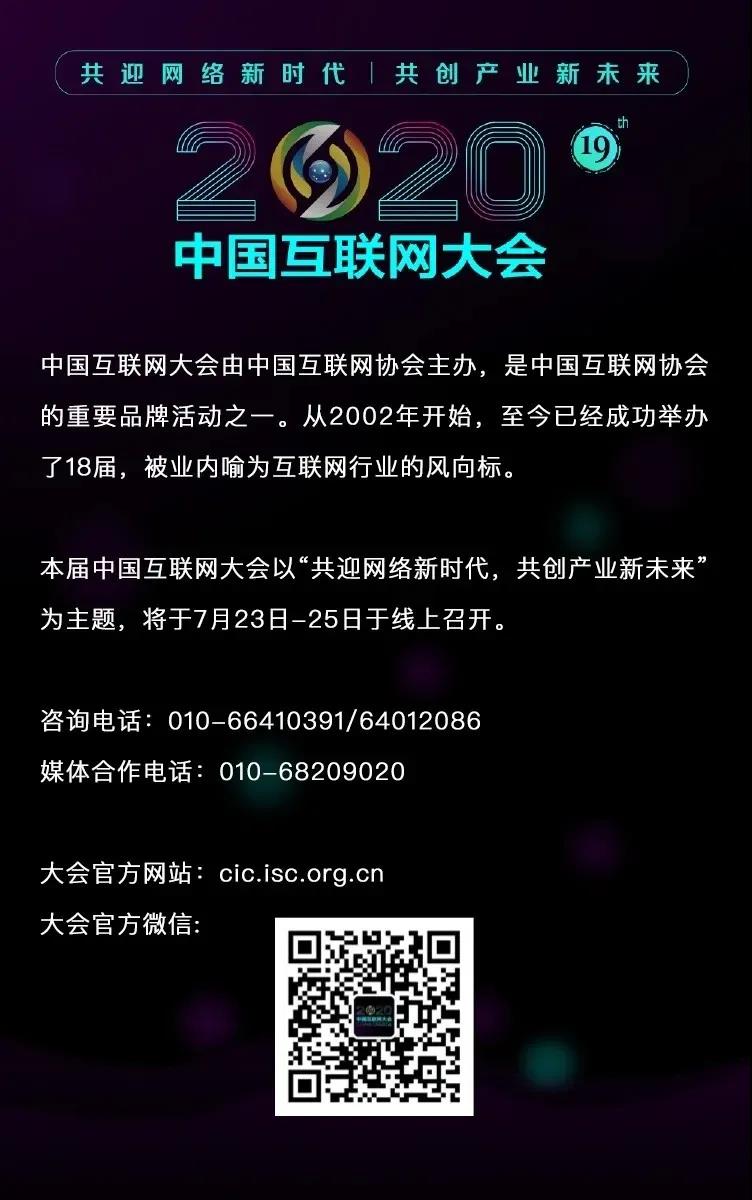 由中国互联网协会主办的2020年(第十九届)中国互联网大会将于7月23日-25日在云端举行,大会的主题是“共迎网络新时代,共创产业新未来”。