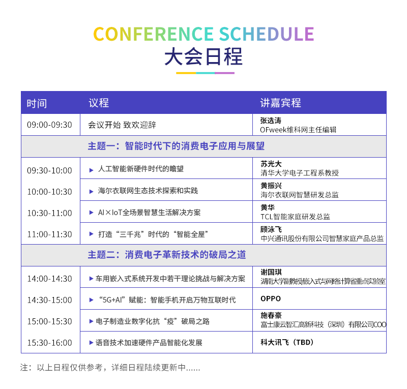 届时,清华大学电子工程系教授苏光大、湖南大学/嵌入式与网络计算省重点实验室副教授谢国琪,两位专家将带来各自对于消费电子产业的经验和洞见,来自海尔、TCL、中兴通讯、OPPO、富士康、科大讯飞的企业高管将针对智能家居、智能终端及硬件、3C制造等多个领域进行全方位、深层次的剖析解读。整场会议看点多多,干货十足!