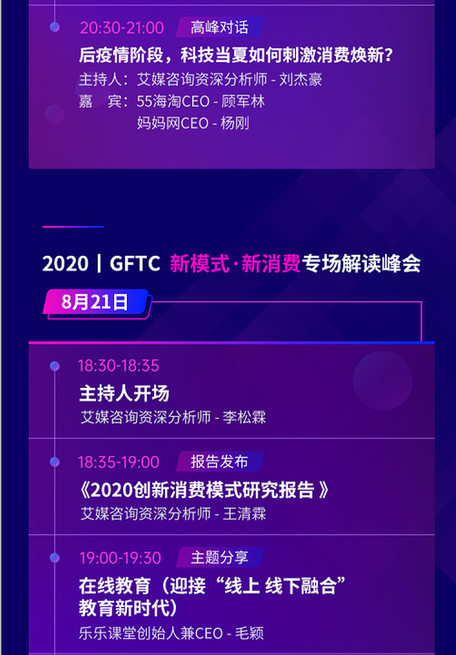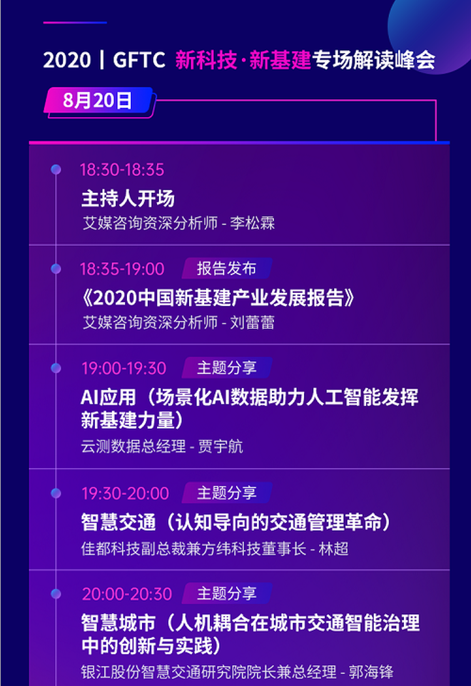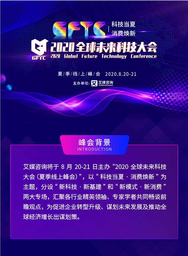 由全球知名的新经济行业数据挖掘和分析机构艾媒咨询集团打造的“2020全球未来科技大会”(夏季线上峰会),将于明晚8月20日18:30-21:00和8月21日18:30-21:00进行网络在线直播,距离开播时间仅剩1天!