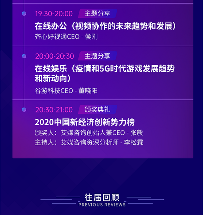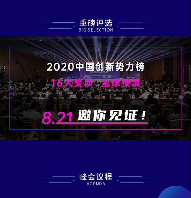 本届大会的重磅大戏--“2020中国创新势力榜”颁奖典礼也将在8月21日的直播间进行,隆重公布获奖企业名单,届时还将与部分获奖的优秀企业进行现场连线。