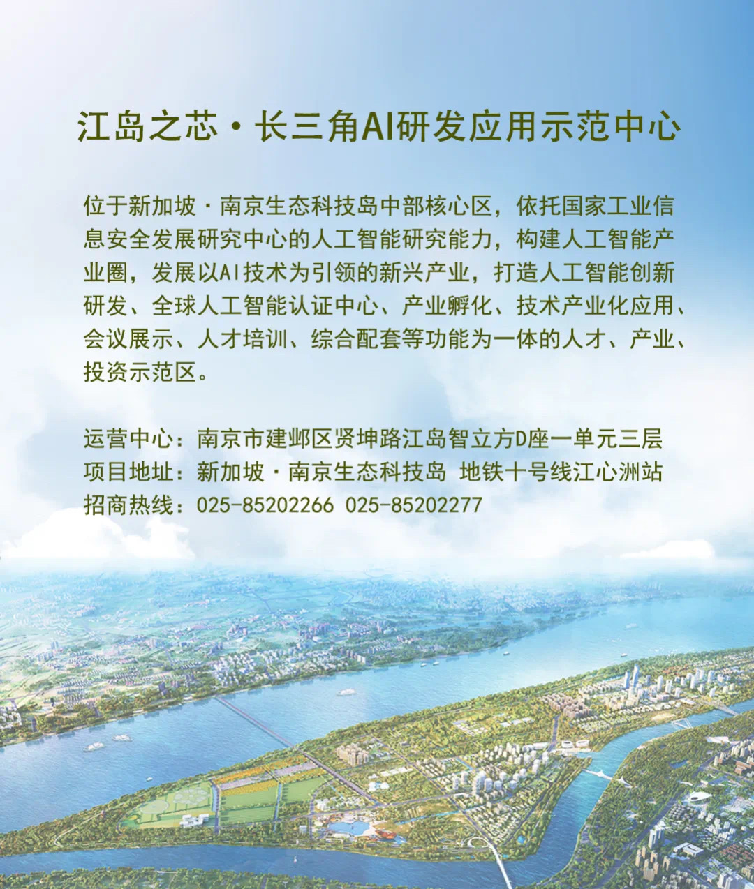 生态科技岛聚焦于双轮驱动,新一代信息技术产业和生态环保产业,其中重点发展人工智能、大数据、云计算、车联网、工业互联网领域。目前江岛之芯·长三角AI研发应用示范中心、华泰证券研发及培训中心、江岛智立方、江苏省环保集团的科技创新基地、南京未来都市出行等一些具有代表性的项目已入驻。到2025年打造一个生产空间集约高效,生活空间宜居适度,生态空间水清岸绿的Mini新加坡花园城市。