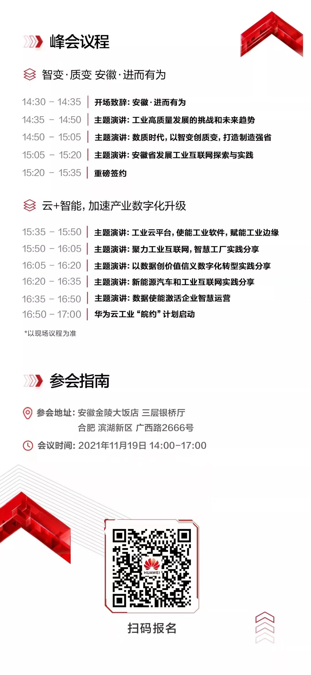 11月19日-11月22日,2021世界制造业将于安徽合肥举办,华为做为铂金合作伙伴,将于11月19日下午在金陵大饭店举办“智变质变安徽·进而有为 华为云城市峰会2021暨工业互联网峰会”。峰会汇聚众多产业专家、城市管理者、建设者和企业家,共同探讨在数字化大潮下,安徽制造业如何加速创新质变,实现高质量发展。