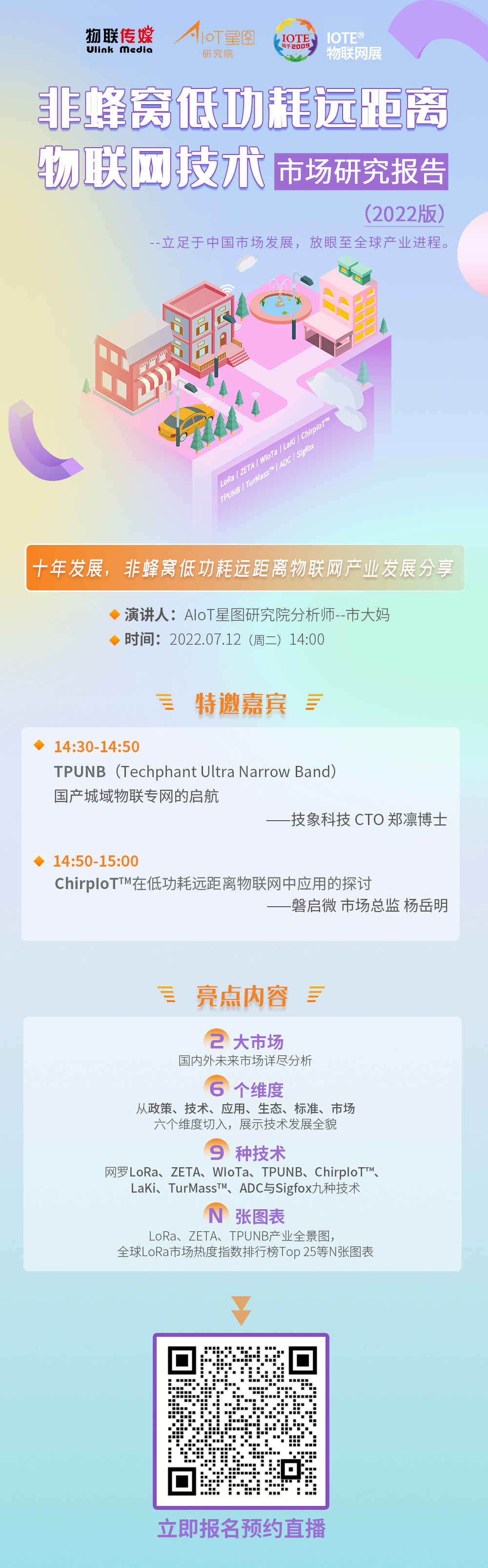 时隔两年,AIoT星图研究院将再次更新一份报告——《非蜂窝低功耗远距离物联网技术市场研究报告(2022版)》,持续追踪LoRa的发展。