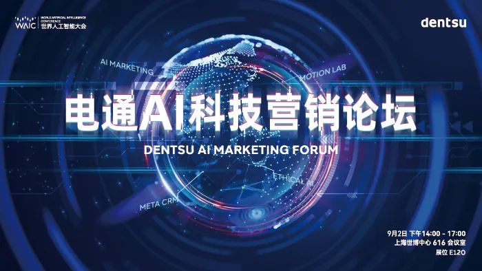 电通中国,为品牌业务增长提供互联营销解决方案的协作体,诚挚地邀请您参加世界人工智能大会电通AI科技营销论坛,该论坛将于9月2日下午2点-5点在上海世博中心616举办,期待与您一起探讨元宇宙时代品牌和市场营销的颠覆性创新!