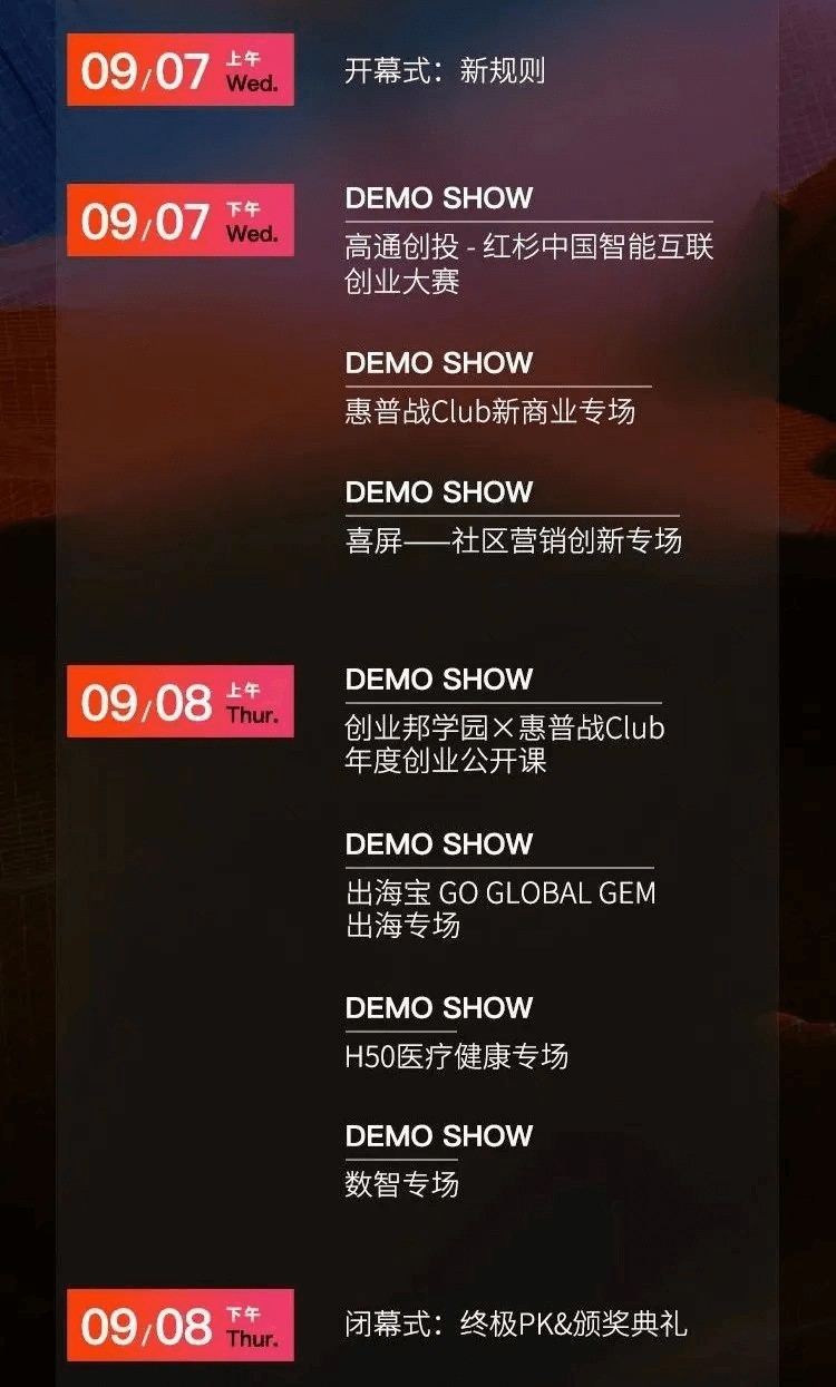 在高通创投-红杉中国智能互联创业大赛专场、惠普战Club新商业专场、H50医疗专场、出海宝 GO GLOBAL GEM 出海专场以及数智专场,来自全国的优秀创业企业将登台路演比拼。