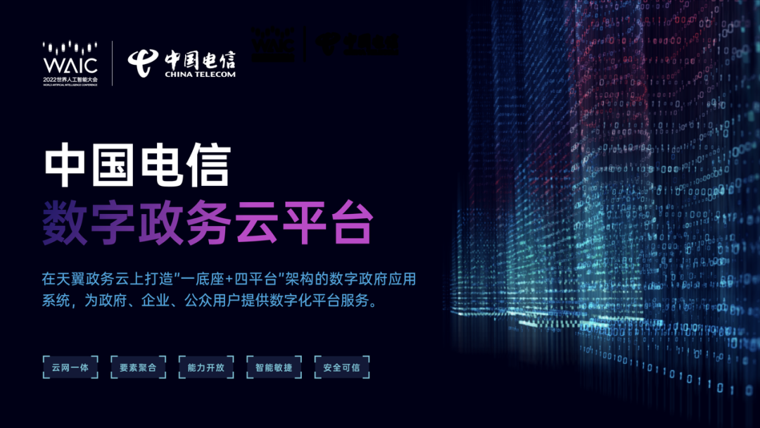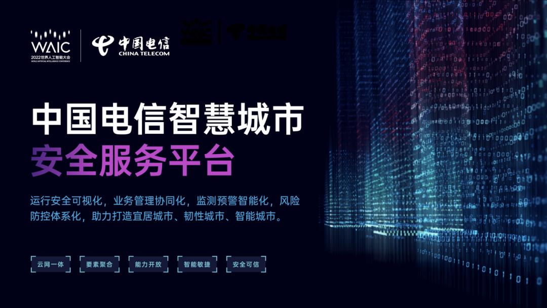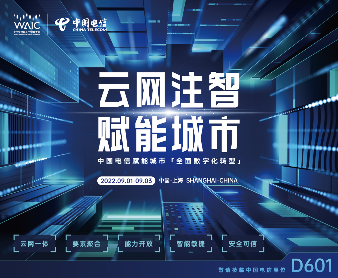 中国电信以“云网注智,赋能城市”为主题,深度围绕“智慧新基建”、“智慧城市”、“智慧生活”、“智慧产业数字化”四大主题版块,亮相2022世界人工智能大会D601展台。