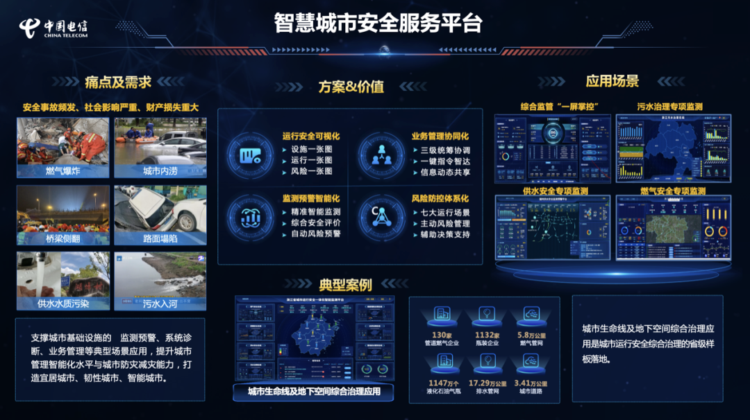 +中国电信智慧城市安全服务平台:中国电信智慧城市安全服务平台针对城市运营过程中燃气爆炸、城市内涝、桥梁侧翻等社会影响严重、财产损失重大的安全事故,提供城市基础设施的监测预警、系统诊断、业务管理等功能,从而提升城市管理智能化水平与城市防灾减灾能力。平台可实现运行安全可视化,业务管理协同化,监测预警智能化,风险防控体系化,助力打造宜居城市、韧性城市、智能城市。