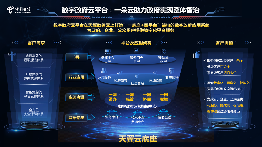 +中国电信数字政务云平台:中国电信数字政务云平台是在天翼云上打造“一底座+四平台”架构的数字政府应用系统,为政府、企业、公众用户提供数字化平台服务。“政务大数据平台”实现省政务部门、地市政务部门数据的互联互通,打破政务“信息孤岛”,推动各部门数据共享。“一网统管”通过政务外网调用和共享,实现城市运行综合管理城市部件、小区、人员和车辆。中国电信建设打造国务院“互联网+督查”平台,有效整合了全国的督查力量和信息资源,实现了督查线索网上实时收集、云端智能分析、线上分类处理、线下督查整改。同时国务院“互联网+督查”平台被列入了《中华人民共和国大事记(1949年10月-2019年9月)》。