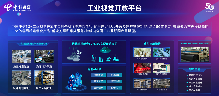 +中国电信5G+工业视觉开放平台:中国电信5G+工业视觉开放平台具备AI视觉产品及能力,提供生产、引入、开放及运营管理功能。平台结合5G定制网、天翼云,聚焦工业视觉数据汇聚、数据治理、5G+MEC边缘管理和智能AI引擎,为客户提供云网一体的端到端定制化产品、解决方案和集成服务。持续向全国工业互联网应用赋能,实现员工穿戴检测、行为检测、色泽外观检测等多场景应用,帮助客户规范行为、规避事故、提升质量、降低成本。