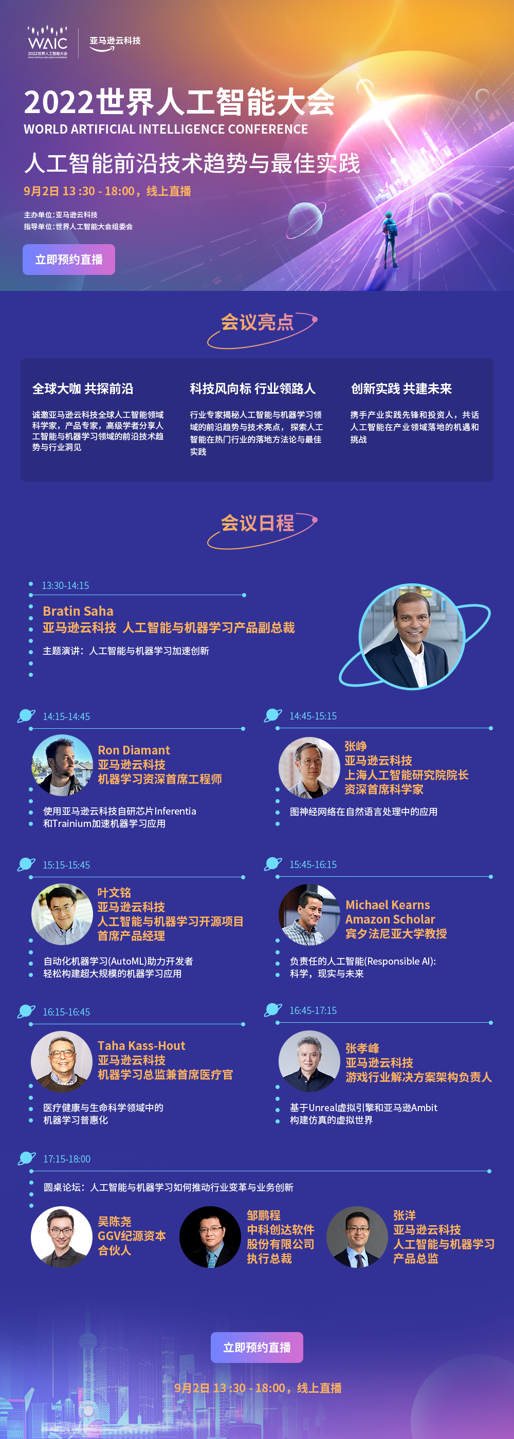 将前沿技术与产业实践结合,并从中不断创造价值是每个AI企业的使命所在。论坛最后,我们还诚邀产业实践先锋,行业投资领袖和亚马逊云科技产品专家一道,以圆桌论坛的形式,共话人工智能在产业领域的落地机遇与挑战,畅谈人工智能如何赋能行业创新, 推动企业转型与产业创新。