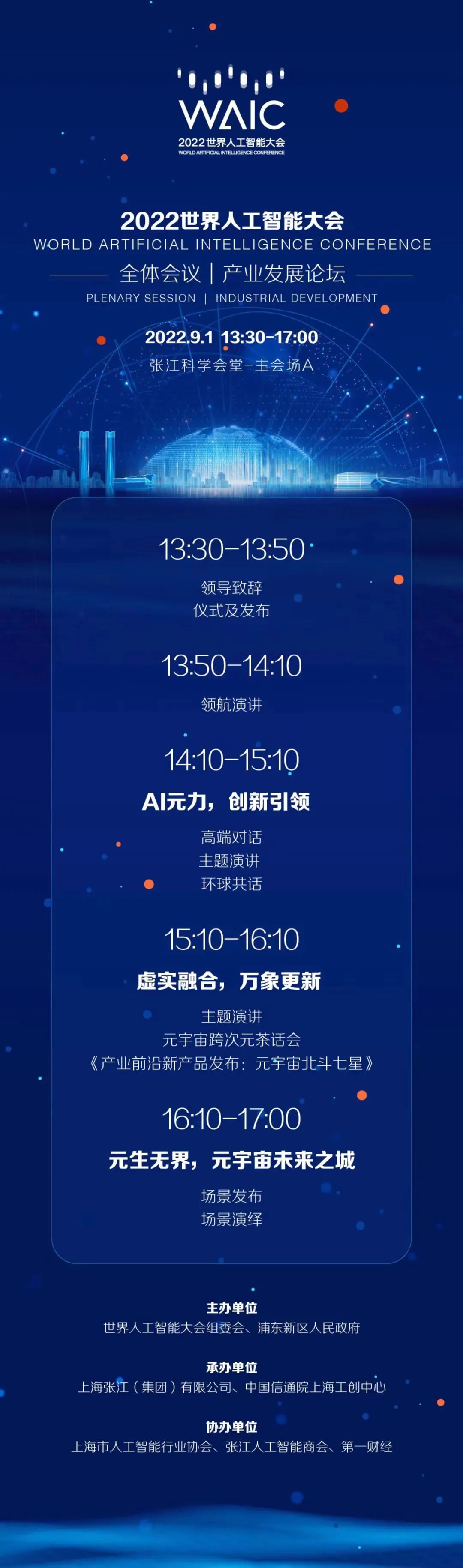 WAIC2022全体会议-产业发展论坛将围绕“AI元力,创新引领”“虚实融合,万象更新”“元生无界,元宇宙未来之城”多个环节展开,针对AI产业发展、机器学习、元宇宙未来新趋势、智能新终端等话题深入探讨。