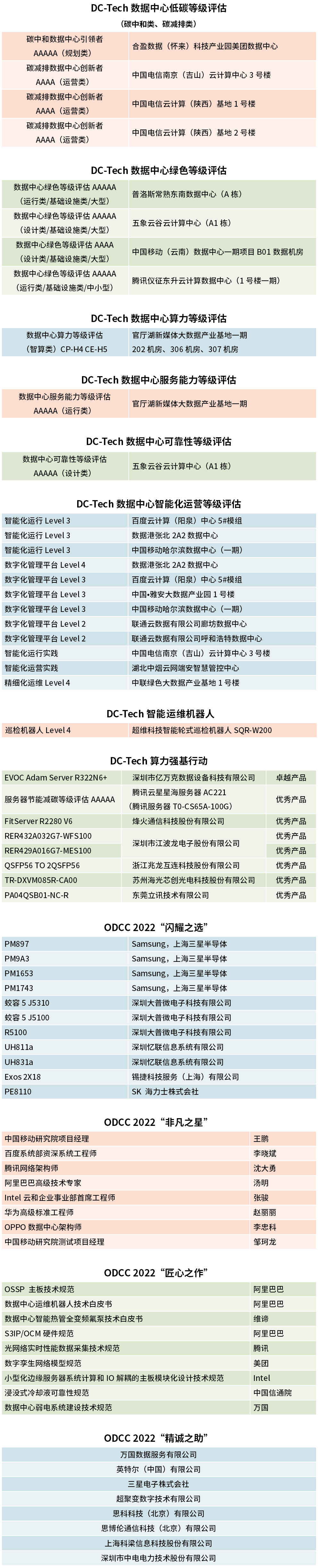 在光辉时刻环节,大会公布了DC-Tech数据中心低碳等级、绿色等级、算力等级、服务能力等级、可靠性等级、智能化运营等级、智能运维机器人、算力强基行动评估结果,及ODCC2022“闪耀之选”“匠心之作”“非凡之星”“精诚之助”等荣誉。