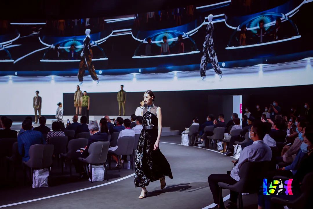 以“虚实共生,海上花开”为主题的时尚创意秀演绎现代东方美学,开幕式现场真人模特与元宇宙线上会场虚拟数字人实现同频走秀,带来全新的时尚设计感官体验。
