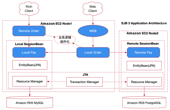 这种分布式架构中,每个EJB业务组件都是独立部署在一个上下文容器中运行,通过网络互相通讯与协作,组件可在本地与远程复用,甚至实现了分布式事务。
