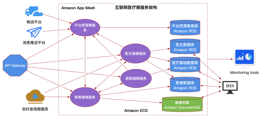 图1 - 2 互联网医疗微服务与分布式架构示例