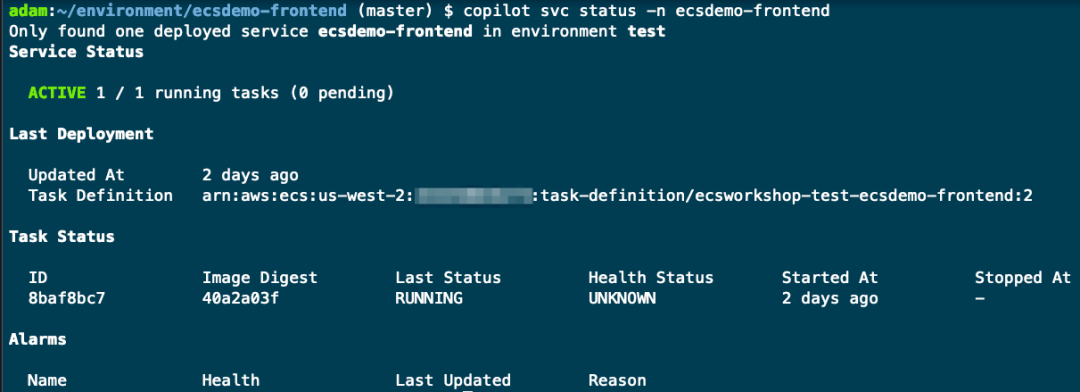 我们可以通过终端命令:"copilot svc status",就能拿到"ecsdemo-frontend"这个容器服务的状态信息,通过捕获的状态信息。