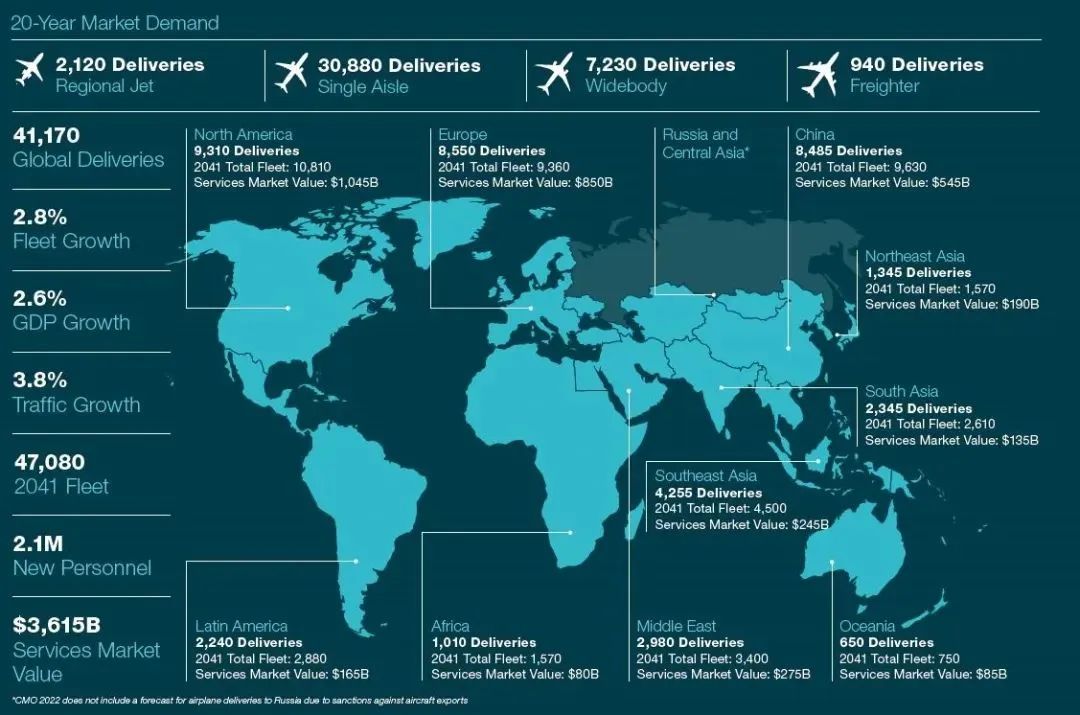 CMO预测到2041年全球将会有41170架飞机交付,将会有2120架支线飞机交付、30880架单通道飞机交付、7230架宽体飞机交付、940架货运飞机交付;