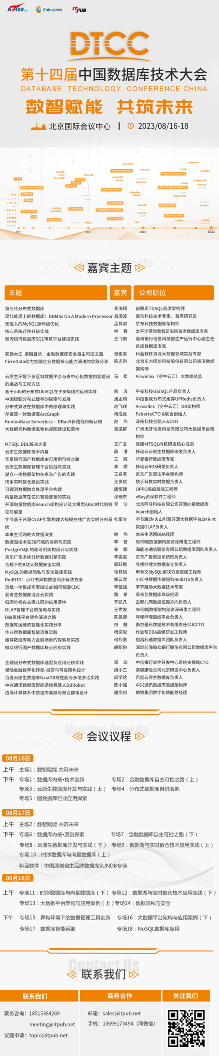 第十四届DTCC大会正式开启,以“数智赋能,共筑未来”为主题的数据库大会,将于今年8月16日-18日在北京国际会议中心举行。此次大会将汇聚国内外顶尖的数据库专家,共同探讨数据库技术的最新进展和未来发展方向。