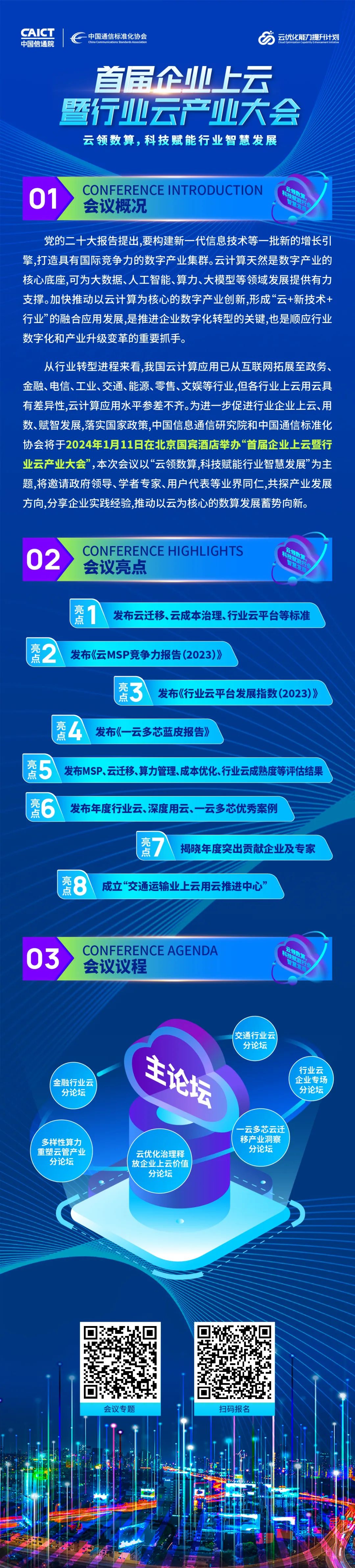 大会介绍:为进一步促进行业企业上云、用数、赋智发展,落实国家政策,中国信息通信研究院和中国通信标准化协会将于2024年1月11日在北京国宾酒店举办“首届企业上云暨行业云产业大会”,本次会议以“云领数算,科技赋能行业智慧发展”为主题,将邀请政府领导、学者专家、用户代表等业界同仁,共探产业发展方向,分享企业实践经验,推动以云为核心的数算发展蓄势向新。