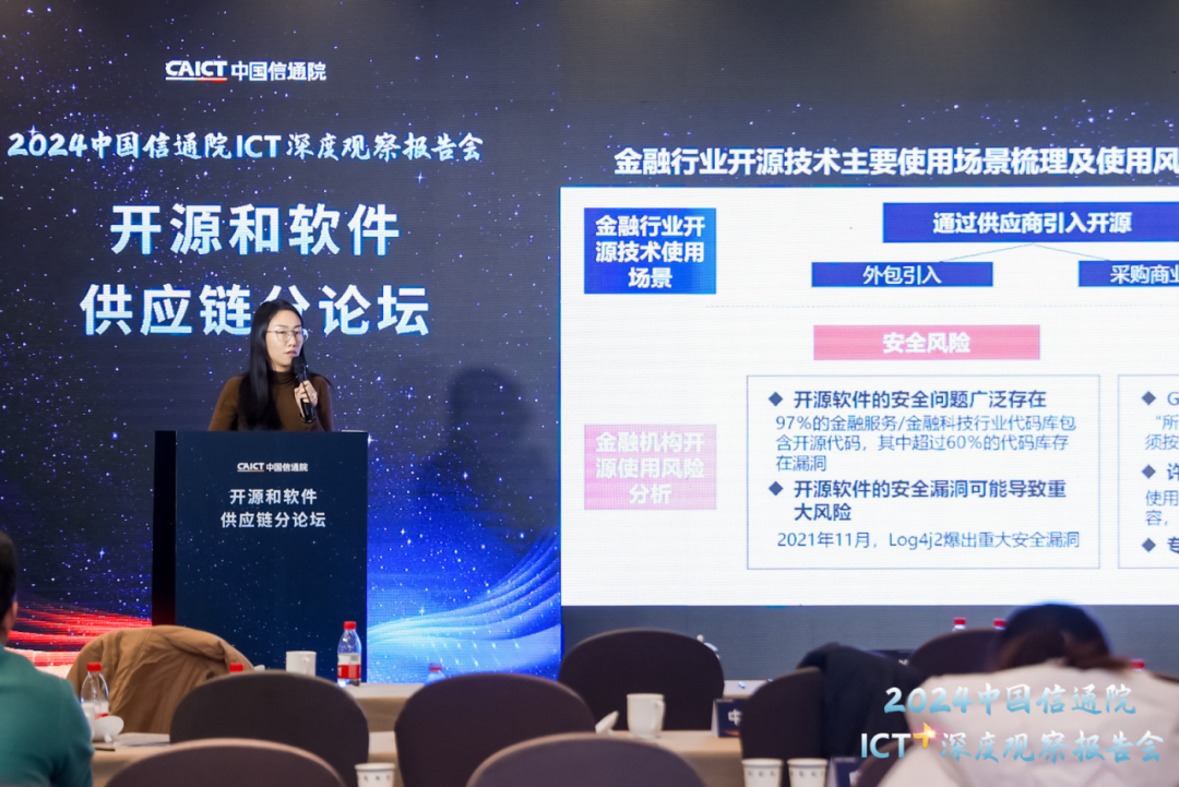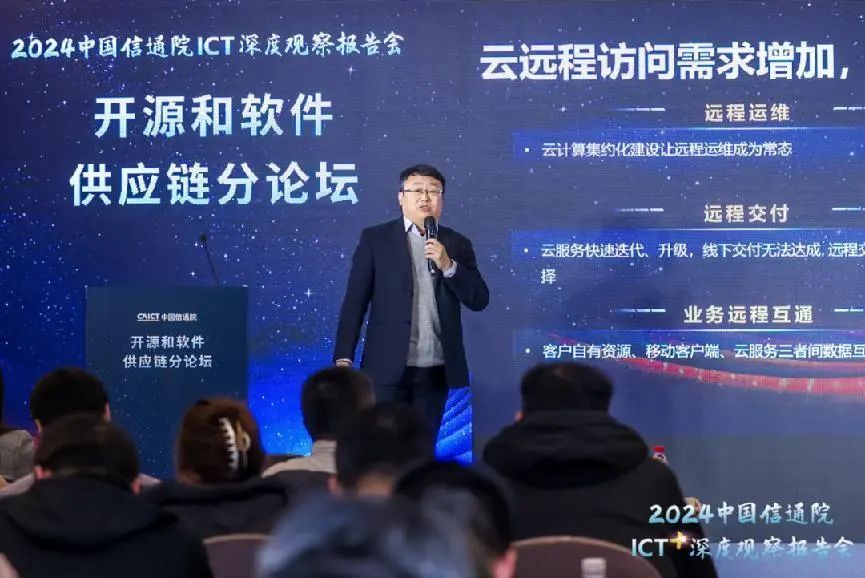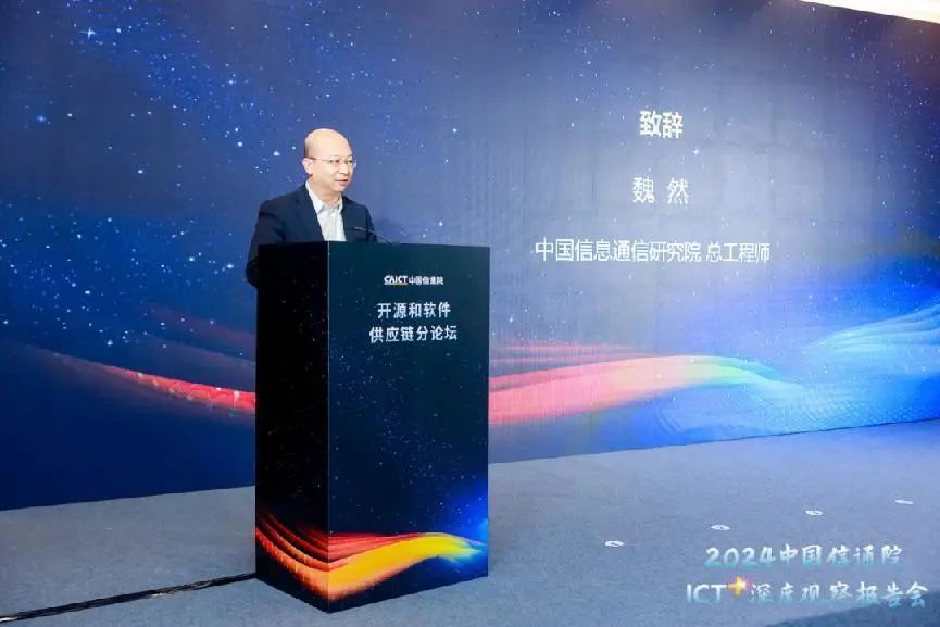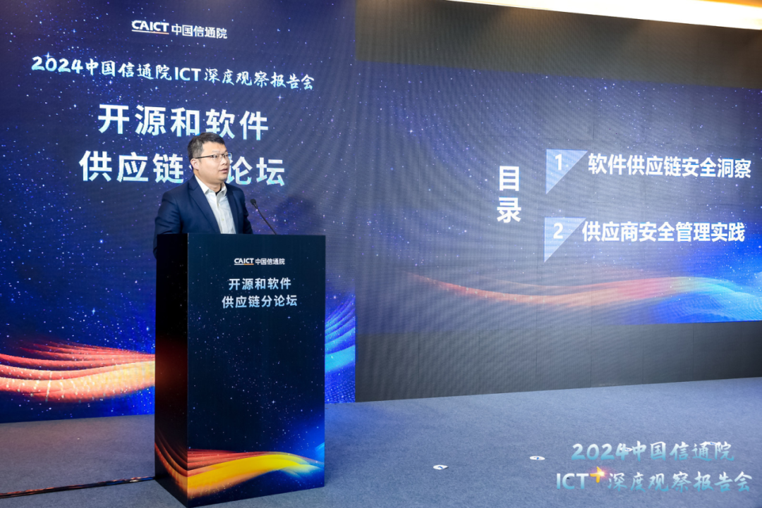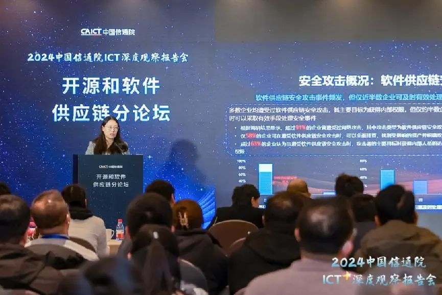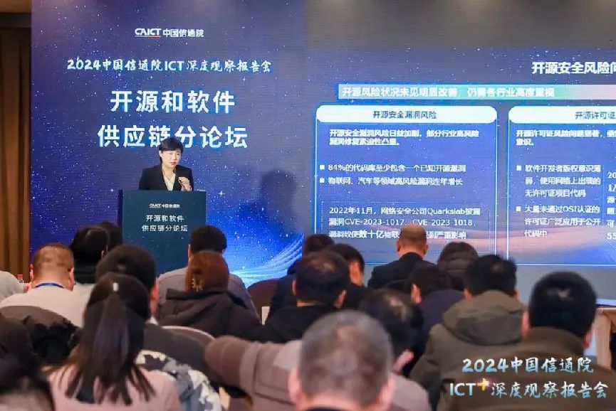 2023年12月21日,由中国信息通信研究院(以下简称“中国信通院”)主办的“2024中国信通院ICT深度观察——开源和软件供应链论坛”在京召开。本届论坛聚焦开源和软件供应链最新发展趋势,围绕开源技术应用能力、软件供应链安全风险等议题开展深入探讨,全面展示中国信通院在开源及软件供应链领域的研究、探索与实践。中国信通院总工程师魏然发表致辞,中国信通院云大所副所长栗蔚等出席会议并进行主题分享。