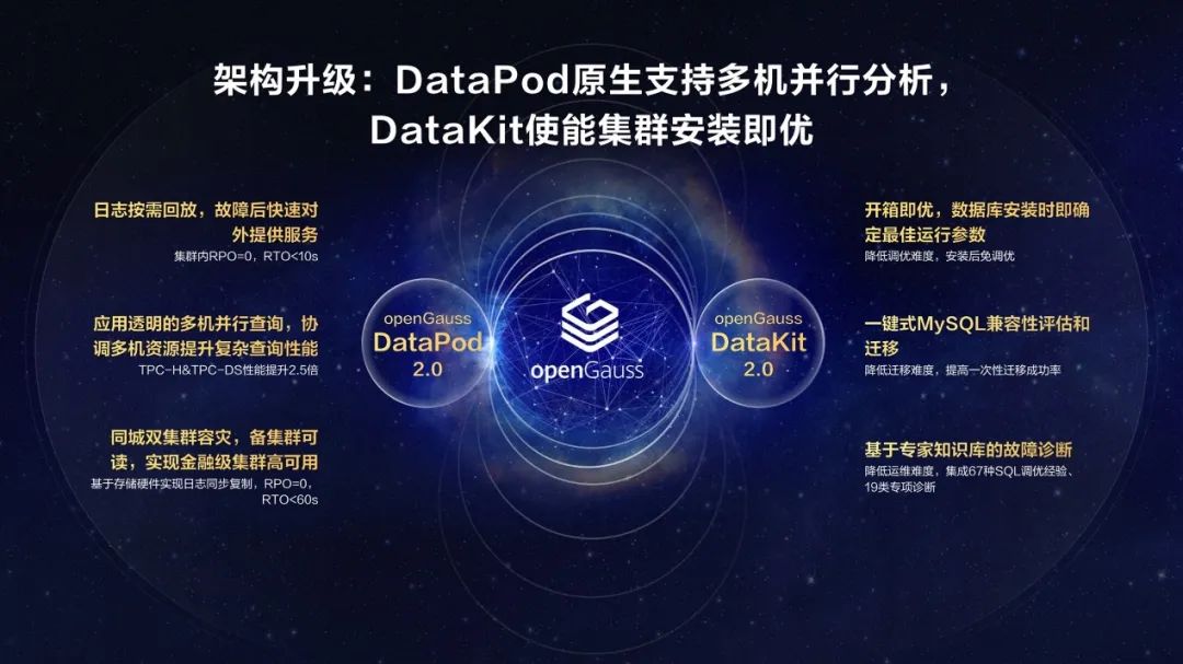 架构方面,DataPod原生支持多机并行分析、提升复杂查询性能;支持基于存储硬件的日志同步复制,实现同城双集群容灾,实现金融级集群高可用;DataKit也将实现对数据库集群安装即最优、支持数据库迁移更平滑、支持基于专家知识库的故障诊断。