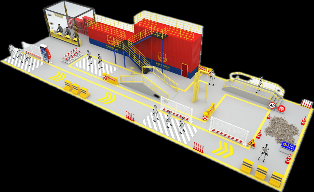 我们在张江科学会堂内搭建了一个全拟真的应急救援竞赛现场。参赛的具身智能机器人,必须在 10m × 30m 的极限赛道中,按固定动线完成一系列对应现实应急救援关键步骤的高难度任务: