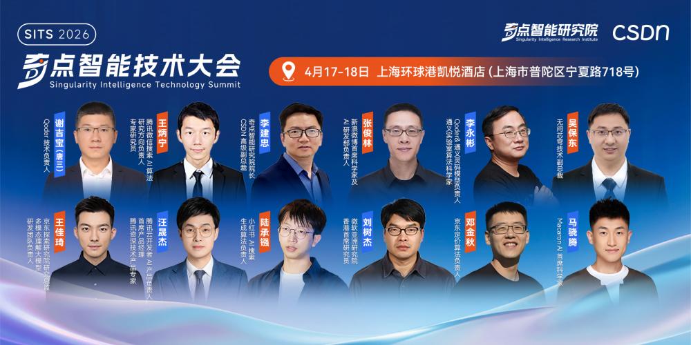 这正是 「2026 奇点智能技术大会」 希望回答的问题。由 CSDN 与奇点智能研究院联合举办的 2026 奇点智能技术大会(原全球机器学习技术大会)将于 4 月 17-18 日在上海·环球港凯悦酒店正式召开。