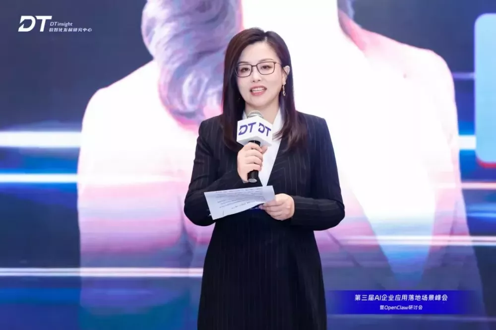 大会开幕伊始,DTinsight中国数智发展研究中心执行主席王雪娜,发表了开幕致辞。她表示,一直以来,行业都在谈大模型、谈技术,但真正能走到业务里、产生价值、解决问题的企业级落地,才是AI的核心战场。而DTinsight,正是业内第一个、也是持续最久、专注聚焦AI企业应用落地场景的专业组织。我们不空谈技术,不追逐概念,只聚焦一件事:让AI真正在企业用起来、用得好、用出价值。
