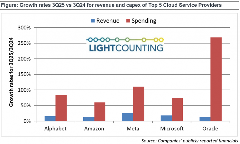 LightCounting表示,这些创纪录的营收主要由Alphabet、亚马逊、Meta、微软和甲骨文的资本开支急剧增长推动。