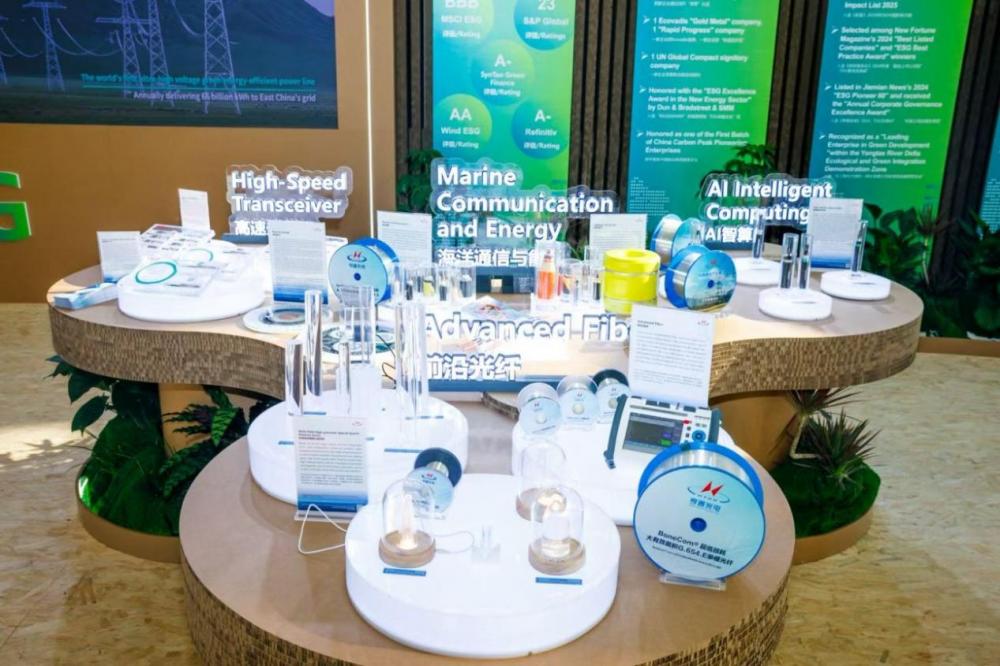作为光纤光缆领域的领导品牌,亨通光电本次以“科技实现可持续”为主题亮相,展示了公司在“双碳”承诺下的各项绿色创新成果。包括空芯光纤、多芯光纤等前沿光纤;应用于AI智算中心的系列光纤;400G/800G高速光模块;以及海缆敷设船、绿色透镜天线等创新产品。