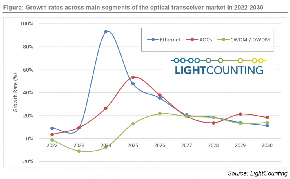 光通信行业市场研究机构LightCounting此前表示,今年光模块市场增长主要来自800G以太网光模块的贡献。另一家机构Cignal AI的首席分析师 Dr. Scott T. Wilkinson表示AI需要更高速率的光模块,2025年800G光模块的出货量同比增长100%。