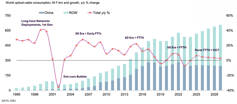 CRU在2024年世界光纤光缆大会期间表示,由人工智能应用驱动的数据中心光缆需求将激增。不过,当时CRU给出的数据是,2024年数据中心的光缆需求占整体市场的5%,到2029年将达到11%。显然,从目前来看,这一预测保守了。