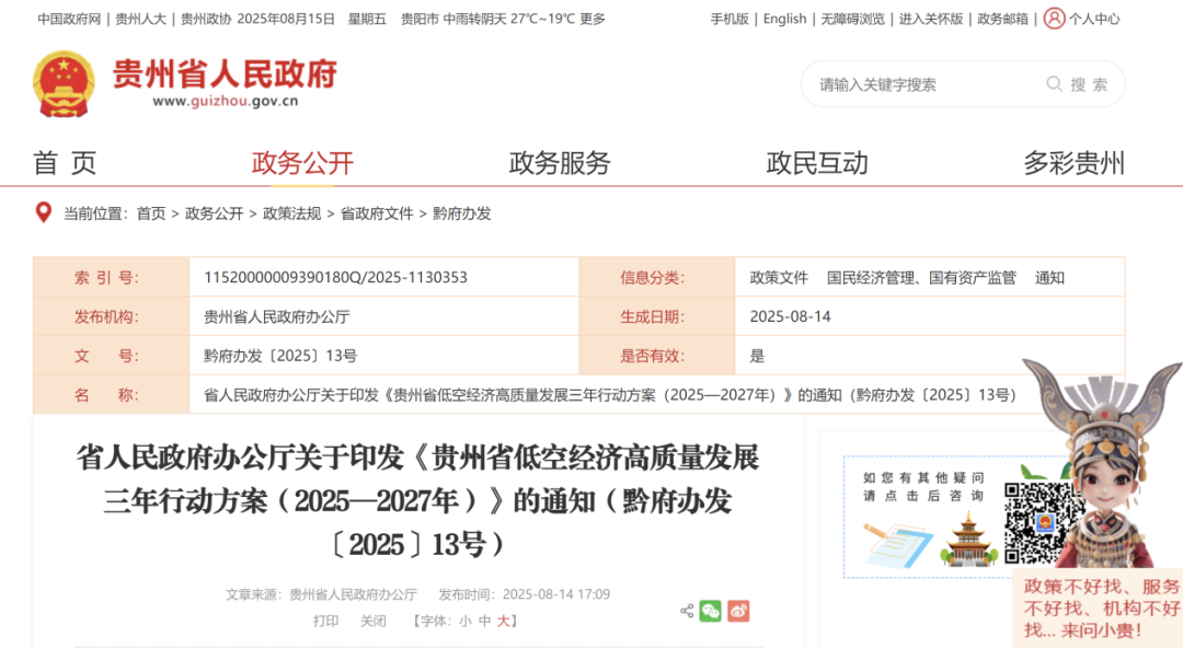 C114讯 8月15日消息(兰茜)近日,为推进贵州低空经济高质量发展,贵州省政府办公厅印发《贵州省低空经济高质量发展三年行动方案(2025-2027年)》(以下简称《方案》)。