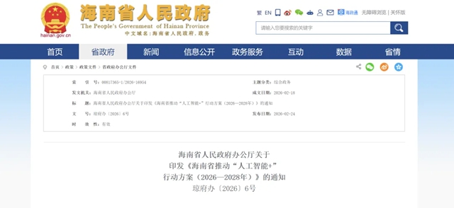C114讯 2月24日消息(兰茜)近日,为抢抓人工智能发展历史机遇,推动人工智能产业和应用实现跨越式发展,海南省人民政府办公厅印发《海南省推动“人工智能+”行动方案(2026-2028年)》(以下简称《方案》)。