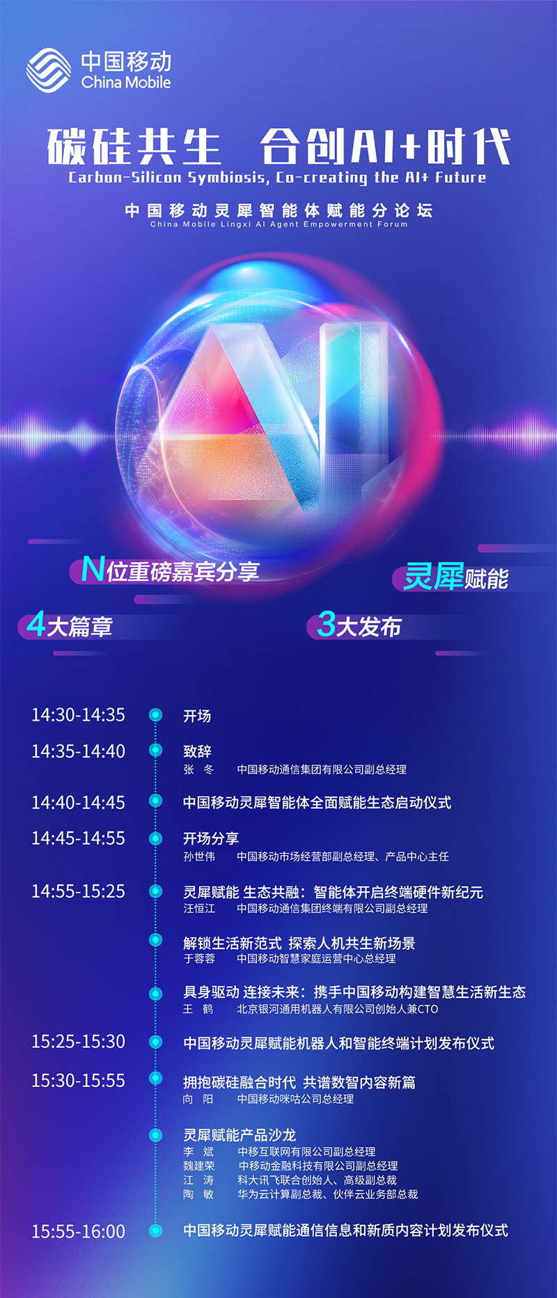 第13届中国移动全球合作伙伴大会将于2025年10月10日至12日在中国广州保利世贸博览馆盛大举行。本次大会以“碳硅共生 合创AI+时代”为主题,中国移动将携手数百家国内外合作伙伴,共同描绘智能时代的崭新图景,携手开启数智未来的全新篇章。10月11日下午,中国移动灵犀智能体赋能分论坛将隆重召开,全面展现灵犀智能体在智能终端、智慧生活、具身智能、数智内容等领域的创新赋能路径并发布相关赋能计划。