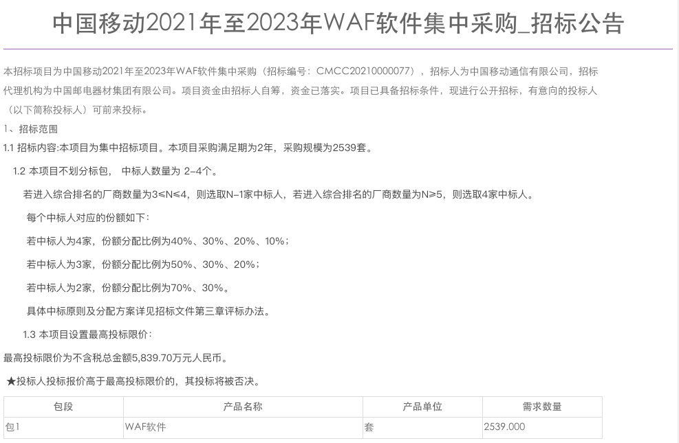C114讯 4月25日消息(九九)中国移动日前发布2021年至2023年WAF软件集中采购招标公告,该项目采购满足期为2年,采购规模为2539套。